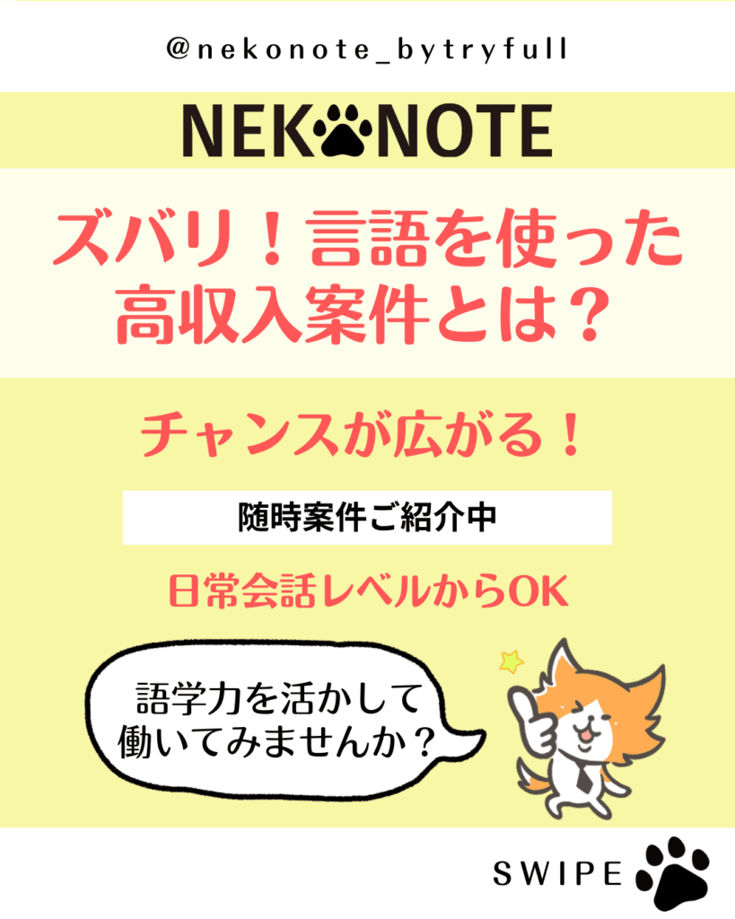 NEKONOTEでは、外国語を使って働ける高収入案件を多数掲載中です。