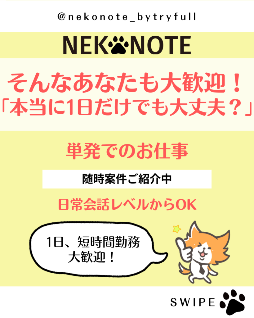 そんな不安をよく聞きます。でもご安心を!NEKONOTEには“1日だけ”の案件や3日間程度の単発案件が多くあります。